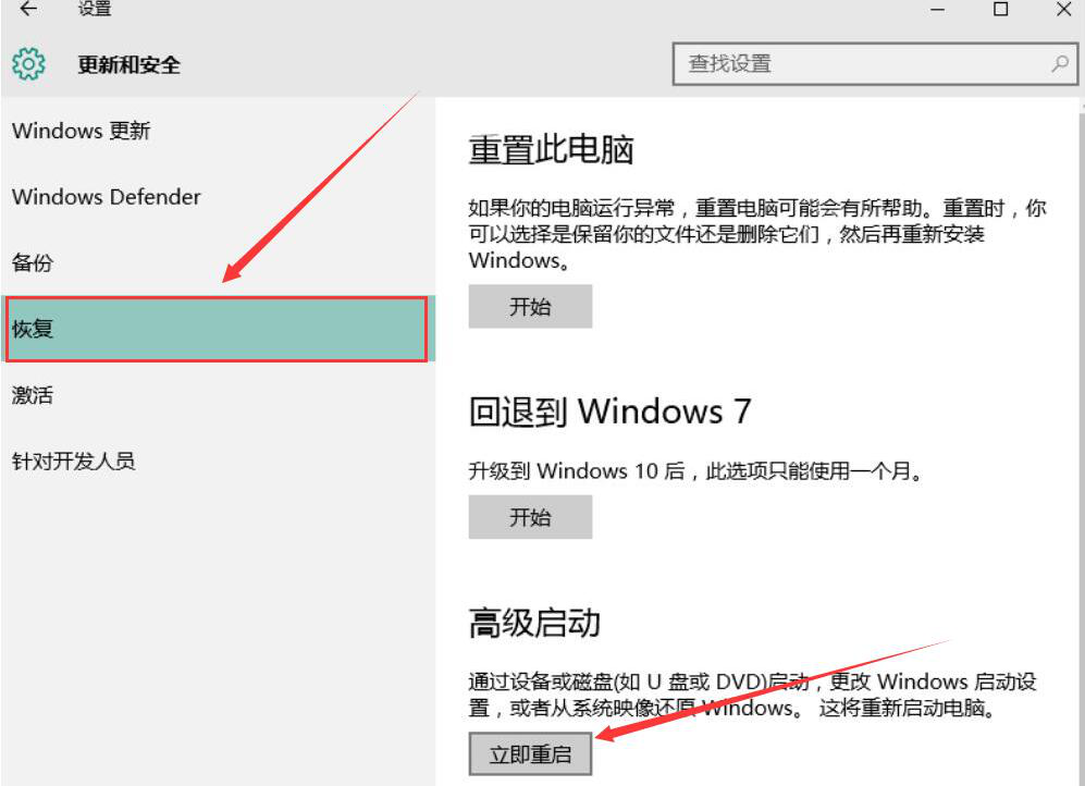 5、在更新和安全的界面中,切换至“恢复”选项卡页面,点击“立即重启”按钮。